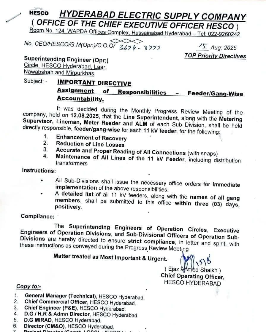 - A detailed list of all 11 kV feeders, along with the names of all gang members, shall be submitted to this office within three (03) days, positively.